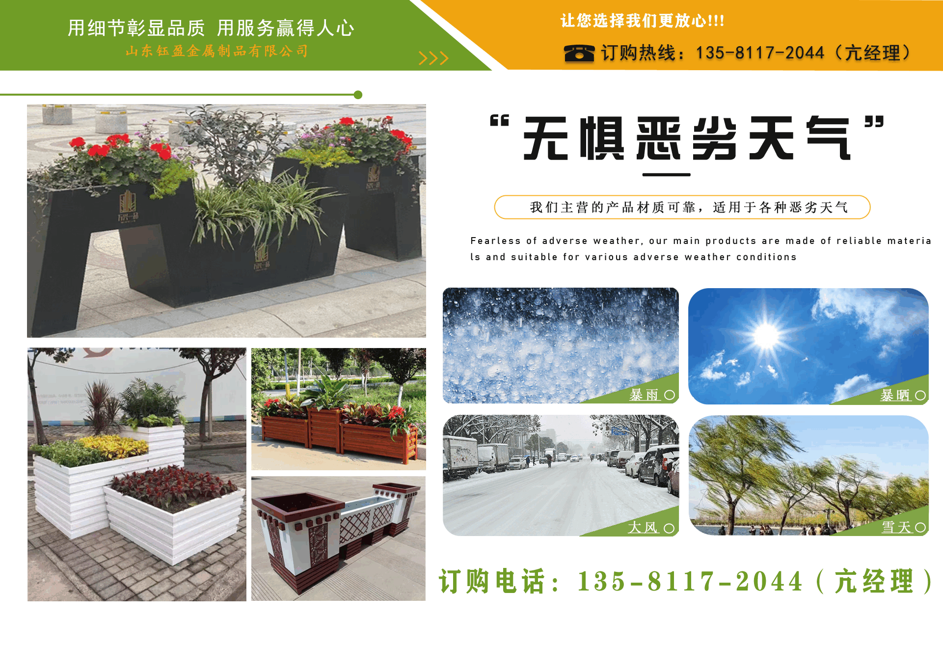 山東鈺盈金屬制品有限公司主營鍍鋅板花箱,道路隔斷花箱,定制花箱,戶外道路花箱,花箱座椅等產品,產品結構合理、性能優良,具有強度高、耐腐蝕、抗老化、隔熱隔音、節約能源、外形美觀、使用壽命長等優點,深受國內外客戶認可?! ∥覀兏鶕蛻羲诔鞘械奈幕卣?,制造出符合當地城市文化氣息的自然立體、觀賞性強的花箱產品成為城市里一道靚麗的風景線?! 」緦嵭姓\實、公正、守信、價格合理、平等互利。  公司憑借雄厚經驗實力,恪守誠信為本的原則,得到了眾多客戶的信賴,并在業界獲得良好的口碑。建立了穩固的合作關系,隨著業務的不斷發展和壯大,合作伙伴的范圍也在不斷擴大。我們熱情盼望與您的合作,為社會的可持續發展獻上一份努力。...